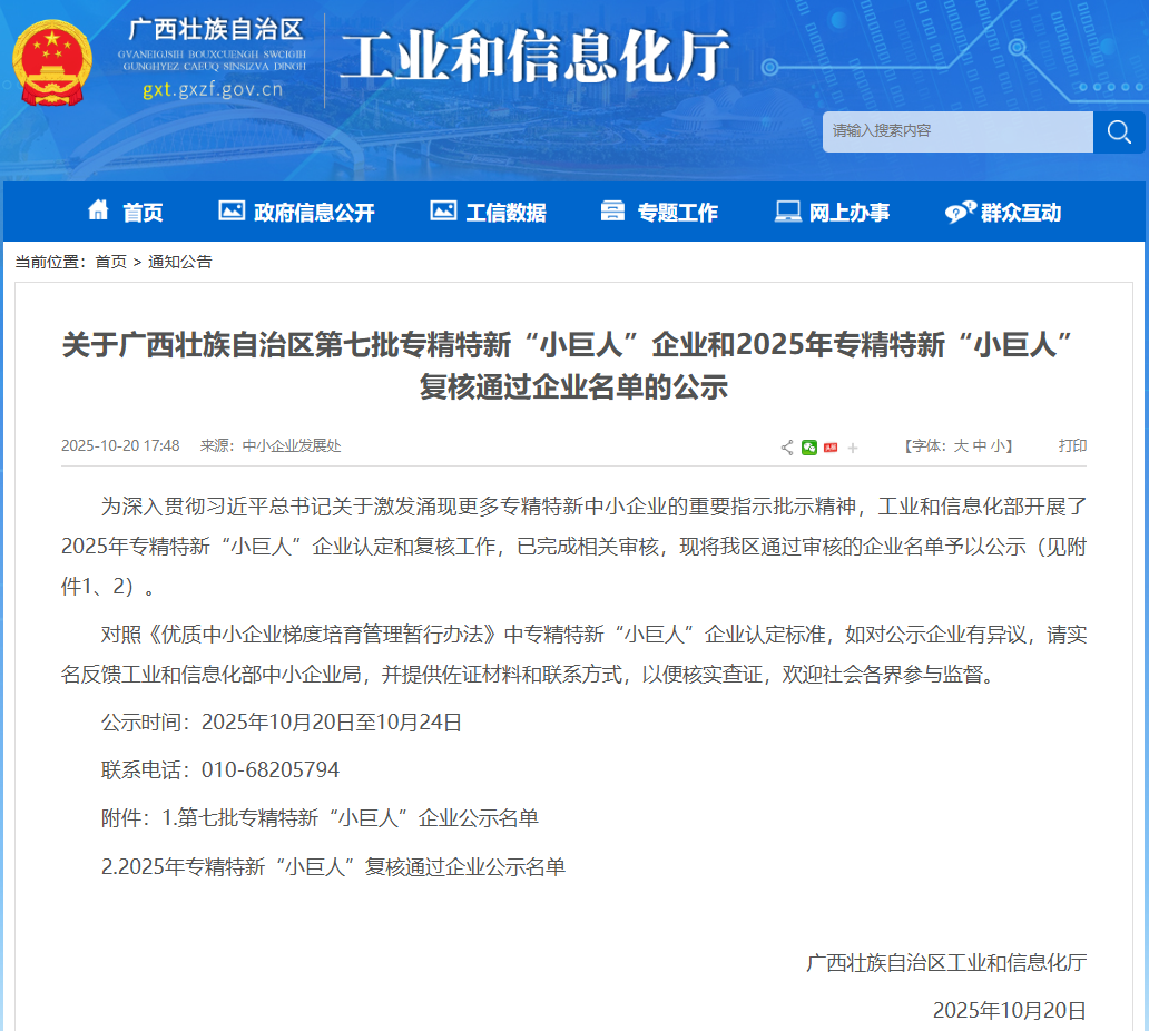 近日,工业和信息化部公布了2025年专精特新“小巨人”复核通过企业公示名单,米兰官方站网页版-米兰online(中国) (以下简称“桂容公司”)凭借在细分领域的核心技术优势与持续创新能力,成功通过国家级复核认定,再次彰显行业领军实力。